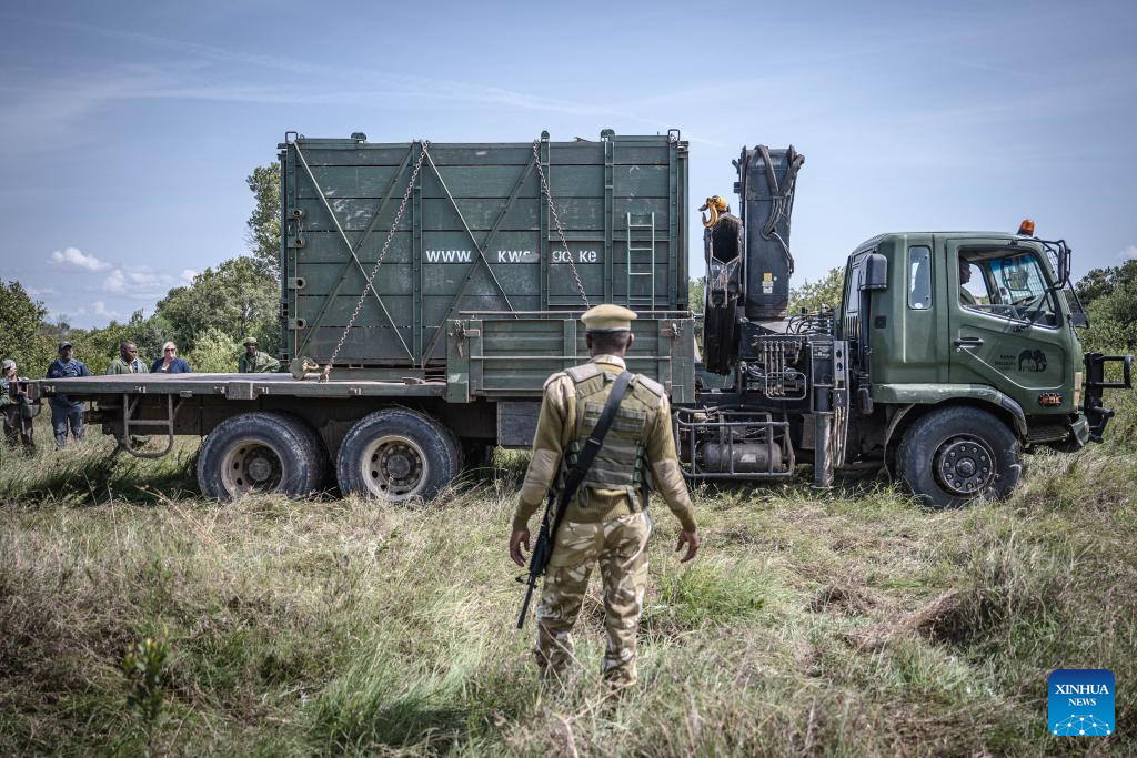 Vehicles of the Kenya Wildlife Service (KWS) relocate a black rhino during a translocation exercise in Laikipia, Kenya, on May 24, 2025. (Xinhua/Wang Guansen)