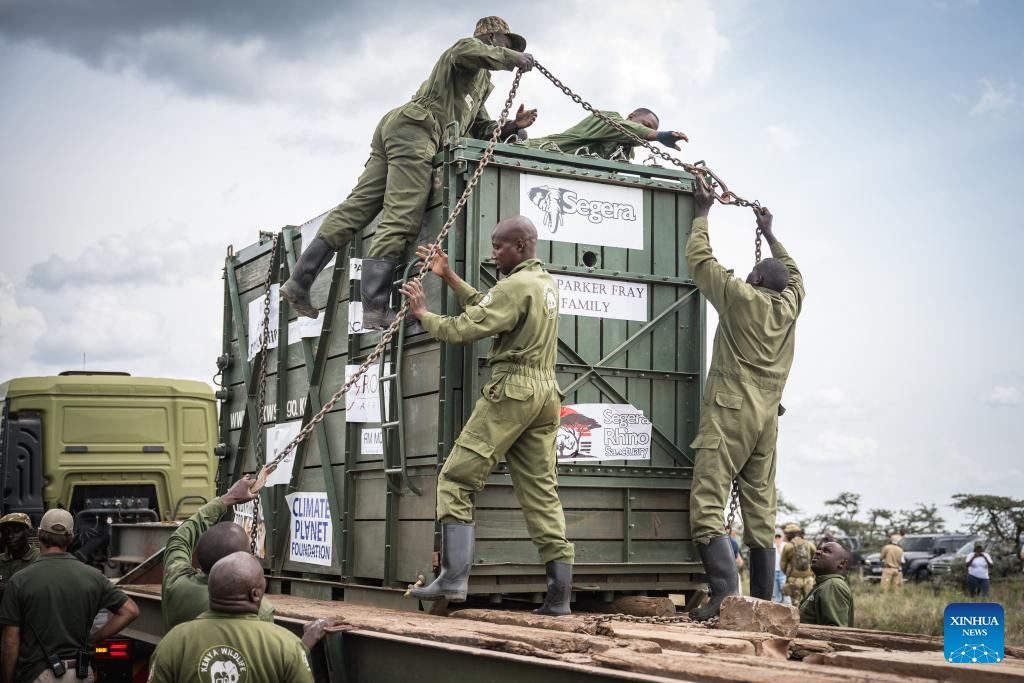 Members of the Kenya Wildlife Service (KWS) prepare to release a relocated black rhino at Segera Conservancy in Laikipia, Kenya, on May 24, 2025. (Xinhua/Wang Guansen)