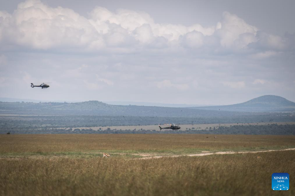 Members of the Kenya Wildlife Service (KWS) track black rhinos aboard helicopters at Ol Pejeta Conservancy in Laikipia, Kenya, on May 24, 2025. (Xinhua/Wang Guansen)