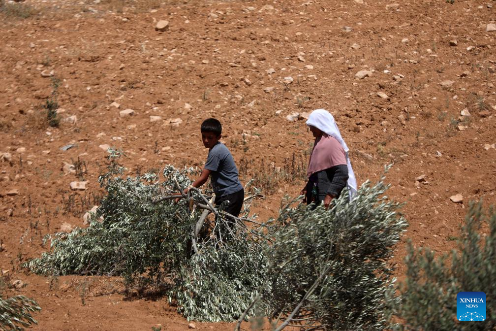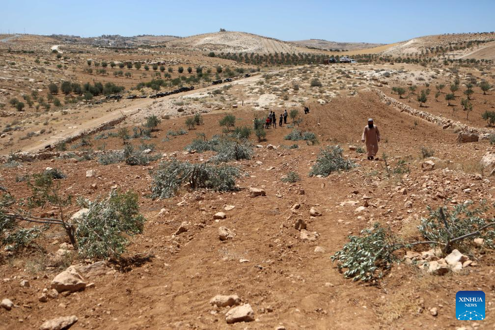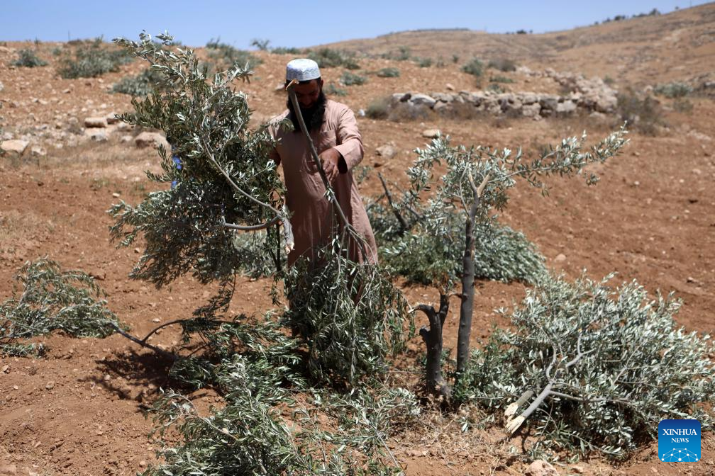 Palestinians check on olive trees vandalized by Israeli settlers in the Yatta area, south of the West Bank city of Hebron, on May 24, 2025. (Photo by Mamoun Wazwaz/Xinhua)