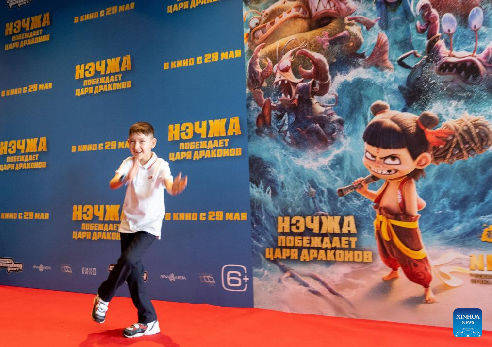 A boy poses for a photo in front of a poster of "Ne Zha 2" after a media premiere in Moscow, Russia, May 25, 2025. Chinese animated blockbuster "Ne Zha 2" had a media premiere in Moscow on May 25, and will be officially released in Russia on May 29. (Xinhua/Meng Jing)