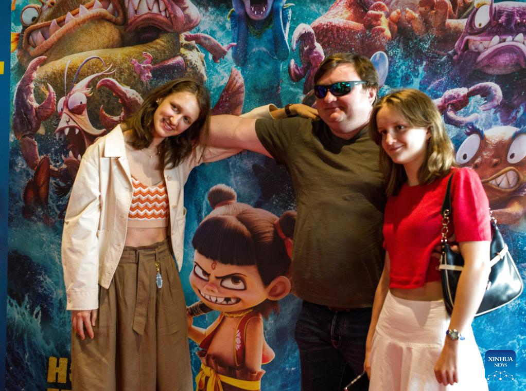 People pose for a photo in front of a poster of "Ne Zha 2" after a media premiere in Moscow, Russia, May 25, 2025. Chinese animated blockbuster "Ne Zha 2" had a media premiere in Moscow on May 25, and will be officially released in Russia on May 29. (Xinhua/Meng Jing)