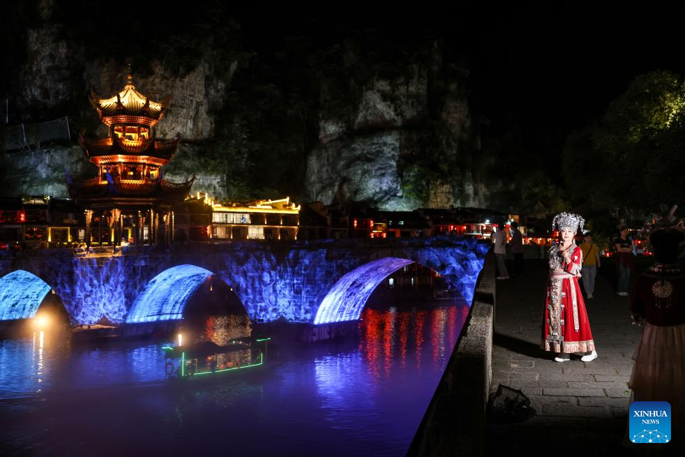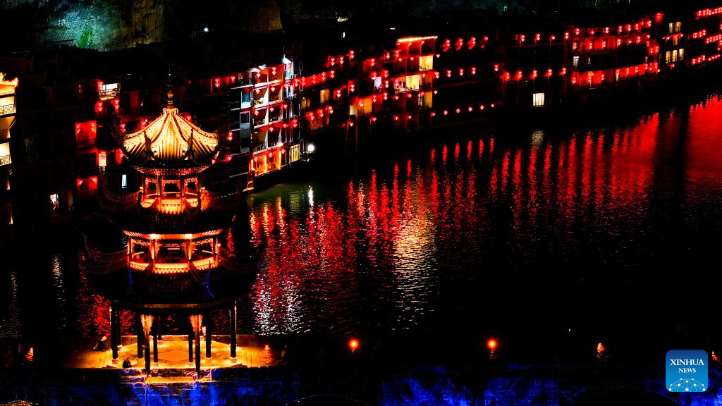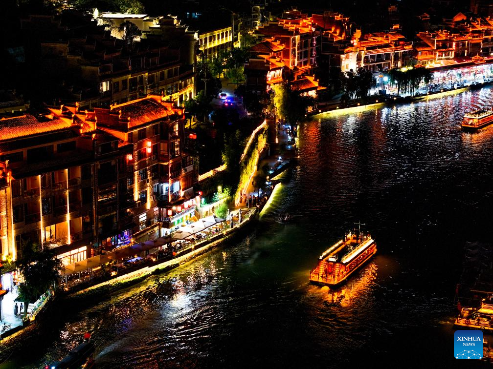 This photo shows a night view of Zhenyuan ancient town in Qiandongnan Miao and Dong Autonomous Prefecture in southwest China's Guizhou Province, May 20, 2025. With a history of over 2,000 years, the ancient town of Zhenyuan sits at riverside in Guizhou's mountains. The Wuyang River curves through its heart, forming a harmonious picture with traditional wooden houses built right over the water. Stone bridges connect both banks, where you can see boats gliding past reflections of glowing lanterns at night. (Xinhua/Ou Dongqu)