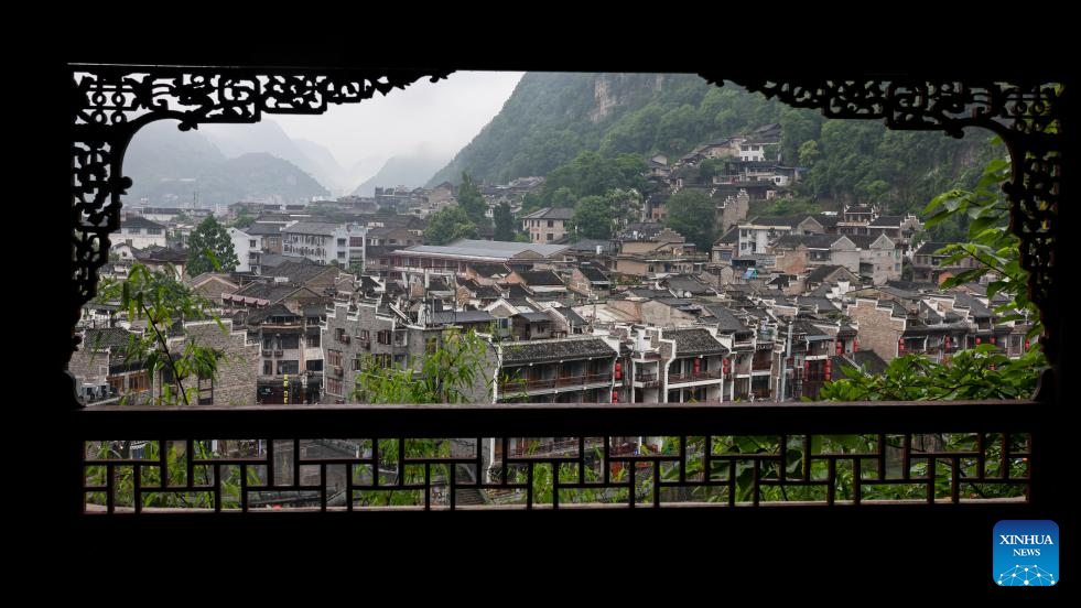 This photo shows Zhenyuan ancient town in misty rain in Qiandongnan Miao and Dong Autonomous Prefecture in southwest China's Guizhou Province, May 21, 2025. With a history of over 2,000 years, the ancient town of Zhenyuan sits at riverside in Guizhou's mountains. The Wuyang River curves through its heart, forming a harmonious picture with traditional wooden houses built right over the water. Stone bridges connect both banks, where you can see boats gliding past reflections of glowing lanterns at night. (Xinhua/Ou Dongqu)