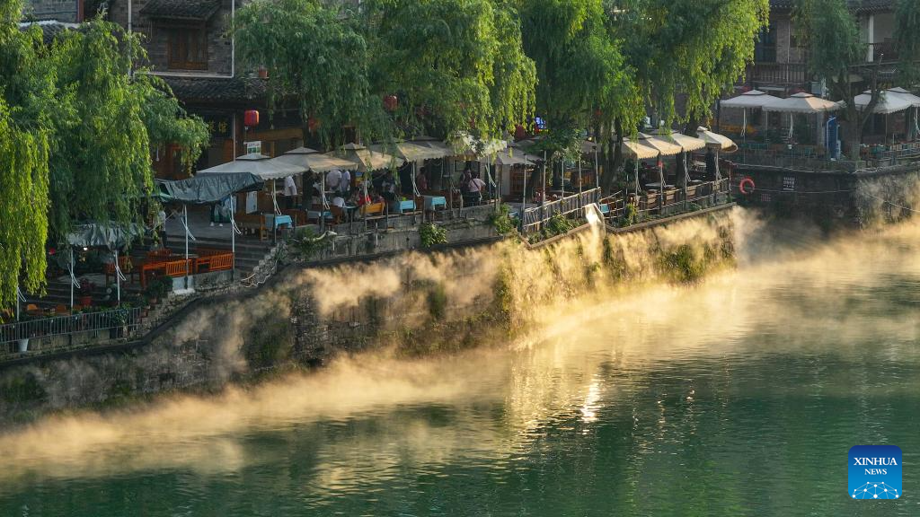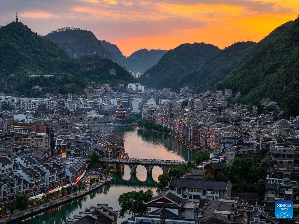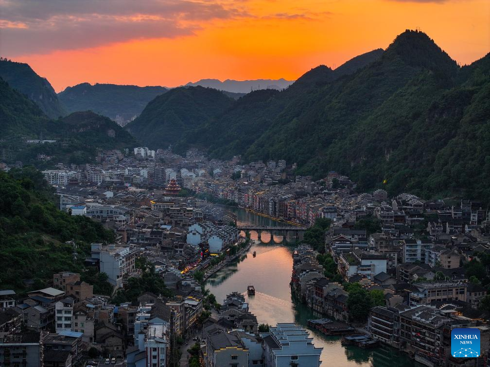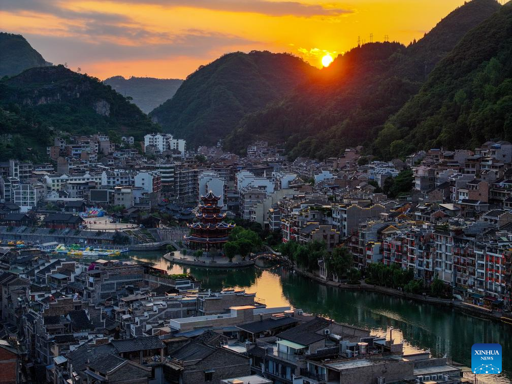 An aerial drone photo shows a sunset view of Zhenyuan ancient town in Qiandongnan Miao and Dong Autonomous Prefecture in southwest China's Guizhou Province, May 20, 2025. With a history of over 2,000 years, the ancient town of Zhenyuan sits at riverside in Guizhou's mountains. The Wuyang River curves through its heart, forming a harmonious picture with traditional wooden houses built right over the water. Stone bridges connect both banks, where you can see boats gliding past reflections of glowing lanterns at night. (Xinhua/Ou Dongqu)