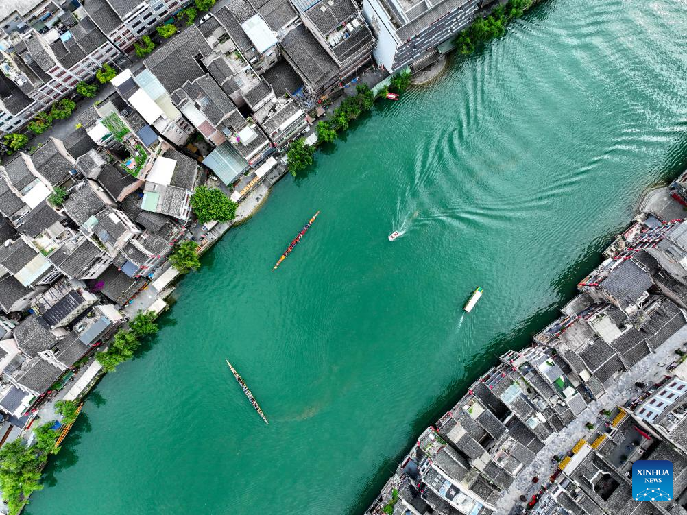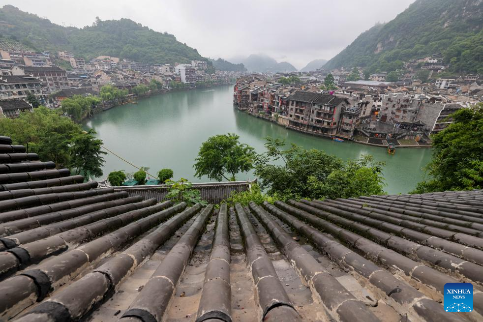 This photo shows a view of Zhenyuan ancient town in Qiandongnan Miao and Dong Autonomous Prefecture in southwest China's Guizhou Province, May 19, 2025. With a history of over 2,000 years, the ancient town of Zhenyuan sits at riverside in Guizhou's mountains. The Wuyang River curves through its heart, forming a harmonious picture with traditional wooden houses built right over the water. Stone bridges connect both banks, where you can see boats gliding past reflections of glowing lanterns at night. (Xinhua/Ou Dongqu)