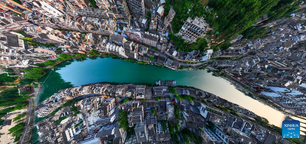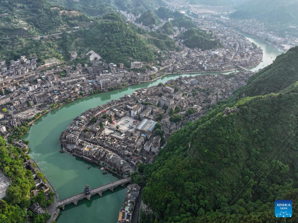 An aerial drone photo shows a view of Zhenyuan ancient town in Qiandongnan Miao and Dong Autonomous Prefecture in southwest China's Guizhou Province, May 20, 2025. With a history of over 2,000 years, the ancient town of Zhenyuan sits at riverside in Guizhou's mountains. The Wuyang River curves through its heart, forming a harmonious picture with traditional wooden houses built right over the water. Stone bridges connect both banks, where you can see boats gliding past reflections of glowing lanterns at night. (Xinhua/Ou Dongqu)