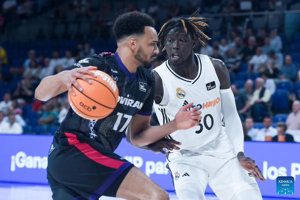Real Madrid's Eli John Ndiaye (R) vies with Coviran Granada's Amine Noua during the Liga ACB basketball match between Real Madrid and Granada in Madrid, Spain, May 25, 2025. (Photo by Gustavo Valiente/Xinhua)