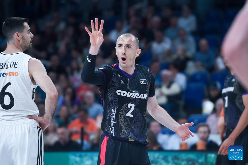 Coviran Granada's Jonathan Rousselle (C) reacts during the Liga ACB basketball match between Real Madrid and Granada in Madrid, Spain, May 25, 2025. (Photo by Gustavo Valiente/Xinhua)
