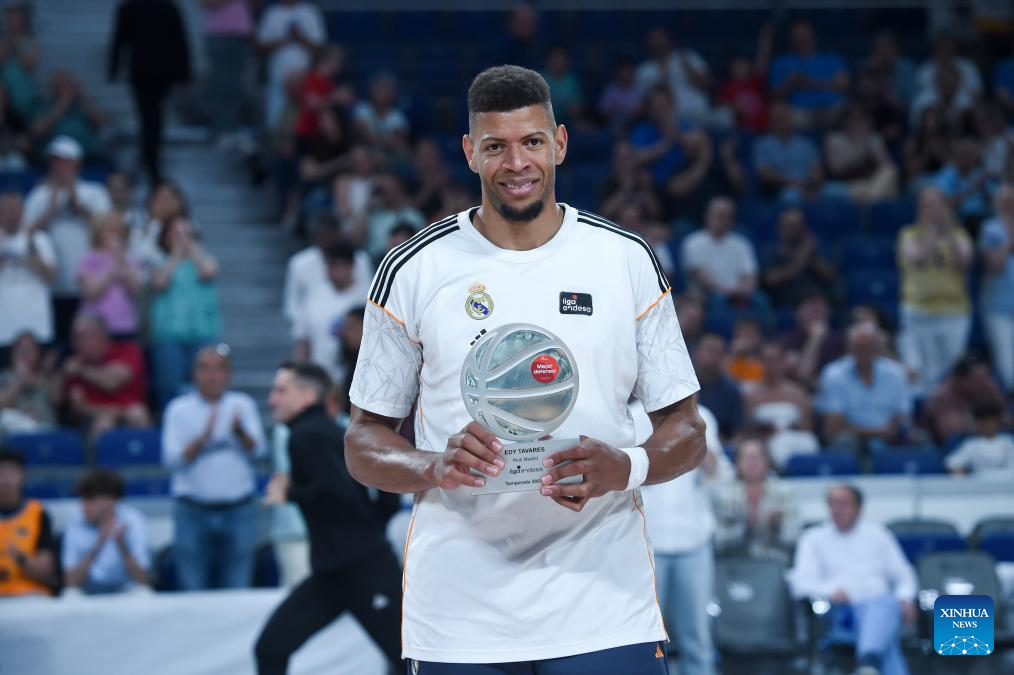 Real Madrid's Edy Tavares receives the Best Defender of the Season prize during the Liga ACB basketball match between Real Madrid and Granada in Madrid, Spain, May 25, 2025. (Photo by Gustavo Valiente/Xinhua)