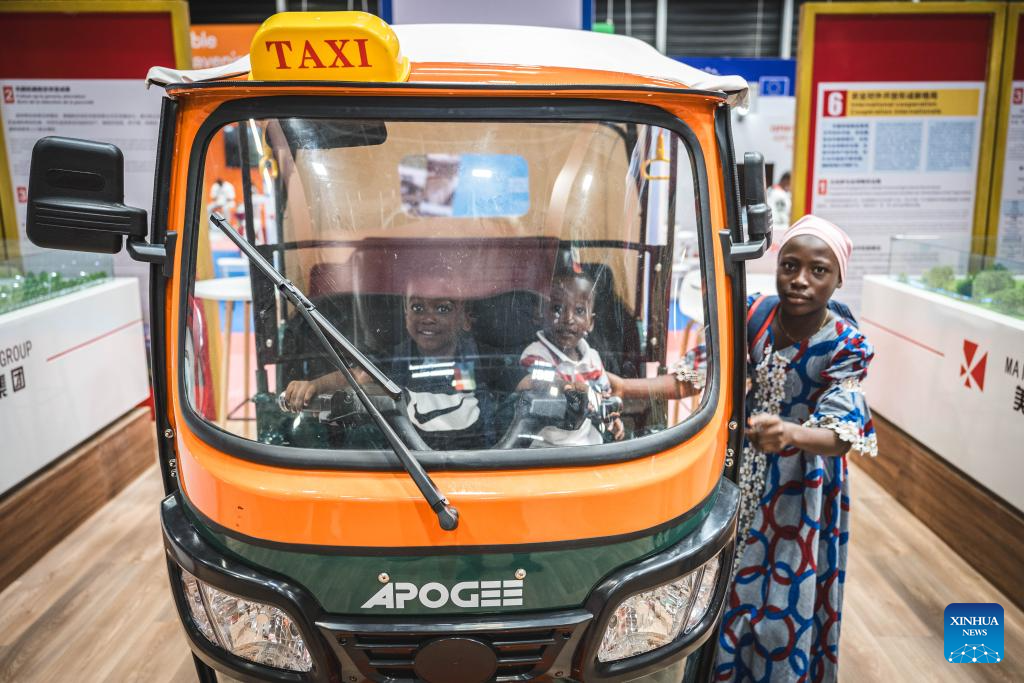 Children have fun in an electric tricycle at the Chinese Pavilion during the 7th Abidjan International Exhibition of Agriculture and Animal Resources in Abidjan, Cote d'Ivoire, on May 26, 2025. The exhibition, a major agricultural fair in West Africa, opened on May 23, 2025, with China participating as the guest of honor. In a 10-day term, the fair is expected to draw more than 500,000 visitors and nearly 1,000 exhibitors showcasing products and services from across Africa, Asia and Europe. (Xinhua/Wang Guansen)