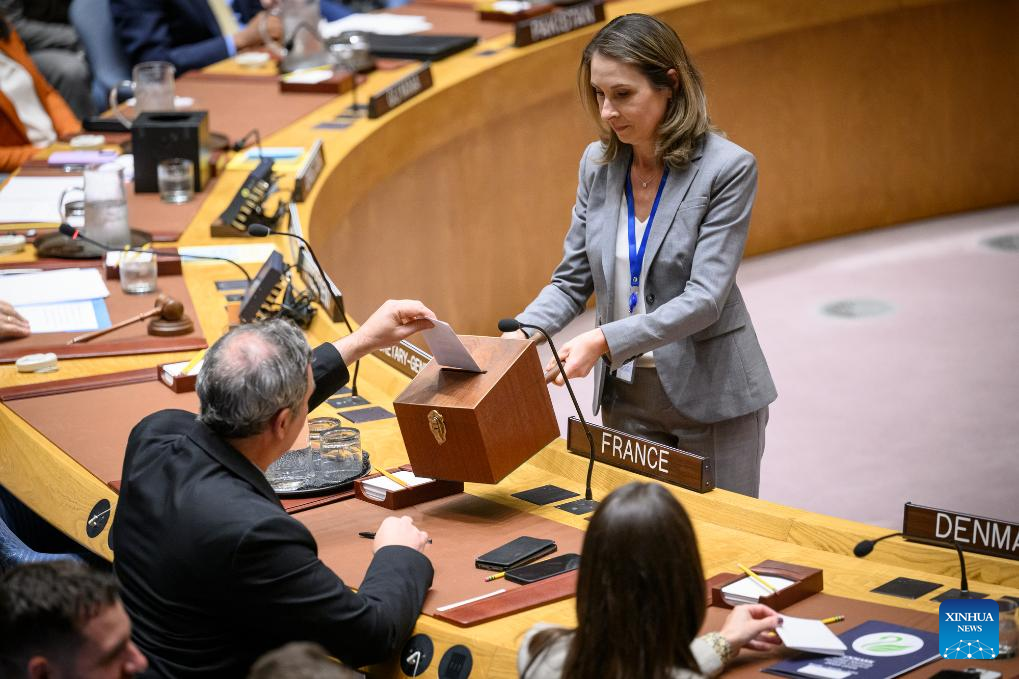 A conference officer collects ballots during a UN Security Council meeting to elect a judge of the International Court of Justice (ICJ) at the UN headquarters in New York, on May 27, 2025. Jordan's UN ambassador Mahmoud Hmoud was elected a judge of the International Court of Justice (ICJ) on Tuesday to replace Nawaf Salam, who resigned in January following his appointment as Lebanese prime minister. (Evan Schneider/UN Photo/Handout via Xinhua)