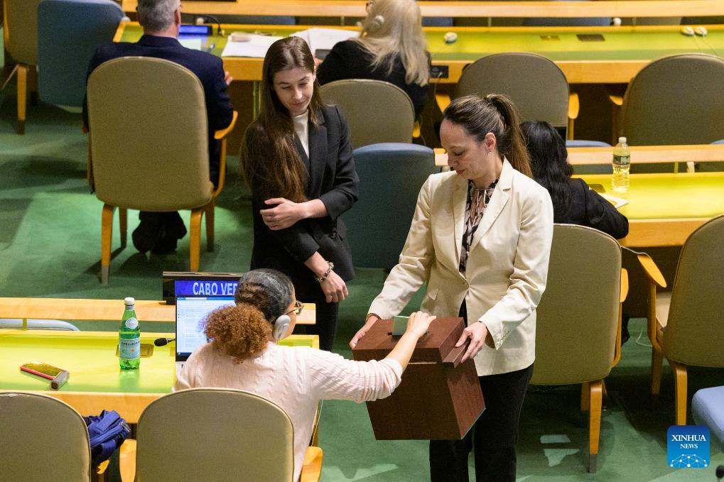 A conference officer collects ballots during a UN General Assembly meeting to elect a judge of the International Court of Justice (ICJ) at the UN headquarters in New York, on May 27, 2025. Jordan's UN ambassador Mahmoud Hmoud was elected a judge of the International Court of Justice (ICJ) on Tuesday to replace Nawaf Salam, who resigned in January following his appointment as Lebanese prime minister. (Manuel Elias/UN Photo/Handout via Xinhua)