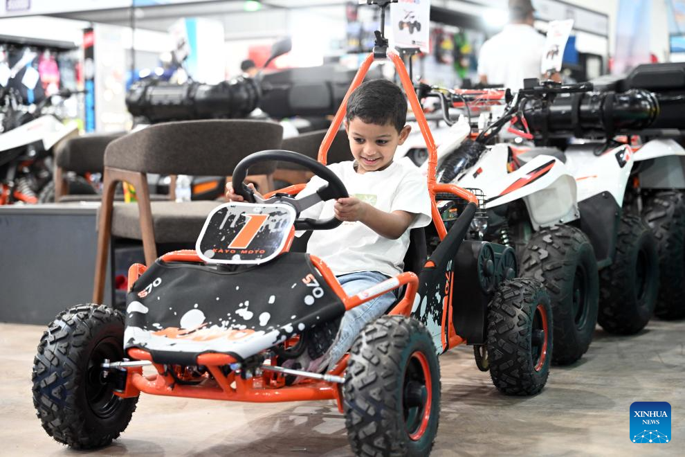 A boy tries a vehicle during the Kuwait International 2025 Expo for Water Activities, Fishing, Hunting and Outdoor Adventures in Hawalli Governorate, Kuwait, May 27, 2025. The expo kicked off here on Tuesday and will run until May 31. (Photo by Asad/Xinhua)