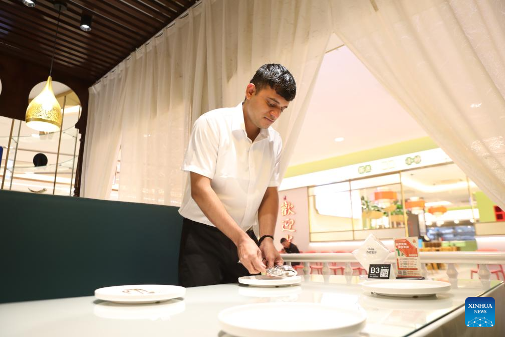 A waiter arranges tableware in the dining room of a South-Asian food restaurant in Lanzhou, northwest China's Gansu Province, May 15, 2025. (Xinhua/Zhang Rui)