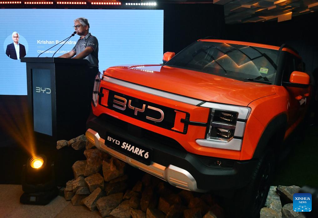 Photo taken on May 27, 2025 shows a BYD SHARK 6 vehicle in Colombo, Sri Lanka. BYD, a Chinese new energy vehicle (NEV) maker, is expanding its footprint in Sri Lanka with plans to introduce DENZA, its premium luxury brand, through local distributor John Keells CG Auto. (Photo by Ajith Perera/Xinhua)