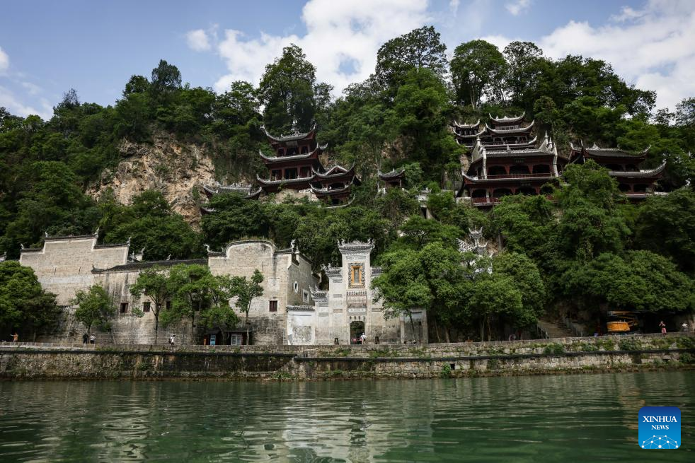 This photo taken on May 20, 2025 shows a view of Qinglong Cave Complex built on the cliff in Zhenyuan ancient town in Qiandongnan Miao and Dong Autonomous Prefecture in southwest China's Guizhou Province. The architectural complex, located on a 300-meter-long and 80-meter-high cliff, is a model of the integration of architectural characters between the north and the south of China. (Xinhua/Ou Dongqu)