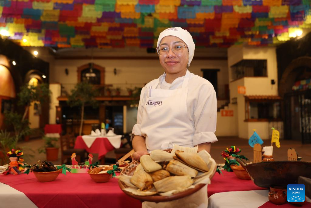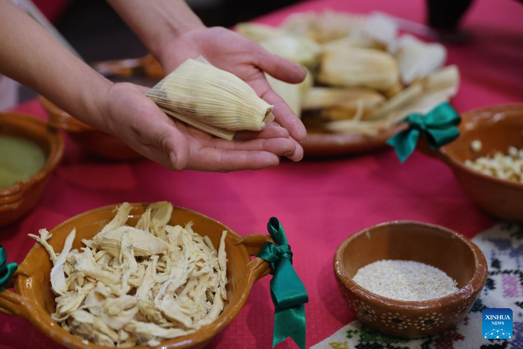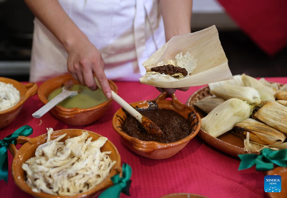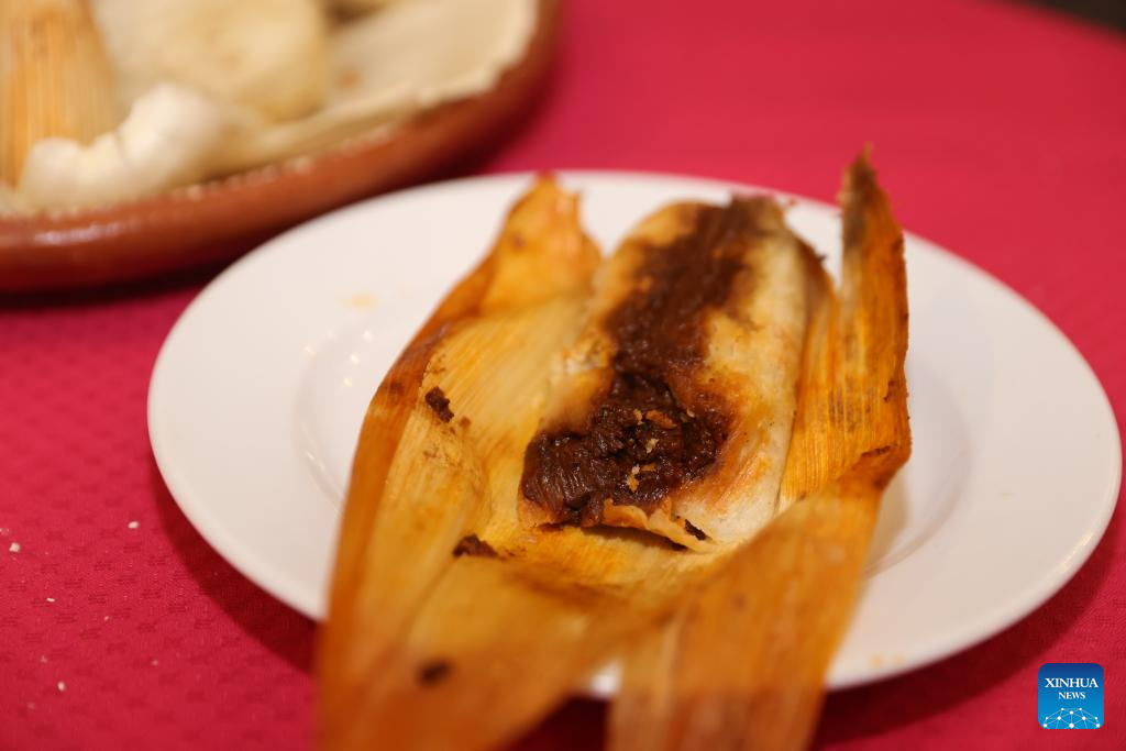 A chef makes tamales at a restaurant in Mexico City, capital of Mexico, on May 28, 2025. Tamales, a traditional Mexican dish similar in shape to Chinese zongzi, are made from ground corn dough stuffed with meat and spices, wrapped and steamed in corn or banana leaves. (Xinhua/Li Mengxin)