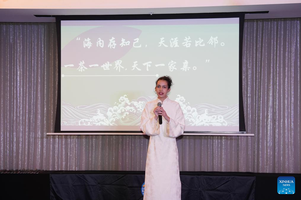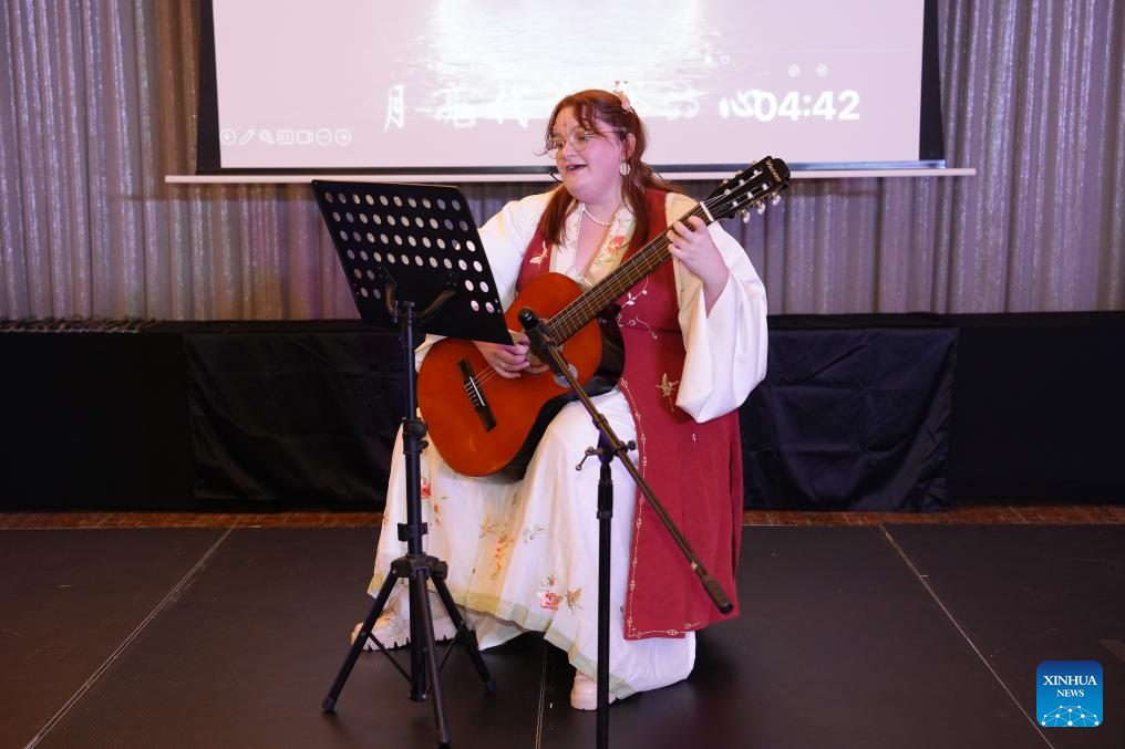 A contestant performs a talent show during the South Africa finals of the 24th "Chinese Bridge" Chinese Proficiency Competition for Foreign College Students in Cape Town, South Africa, on May 30, 2025. The South Africa finals of the 24th "Chinese Bridge" Chinese Proficiency Competition for Foreign College Students took place on Friday in Cape Town, the country's legislative capital, where participants showcased remarkable language abilities and cultural talents. (Xinhua/Wang Lei)