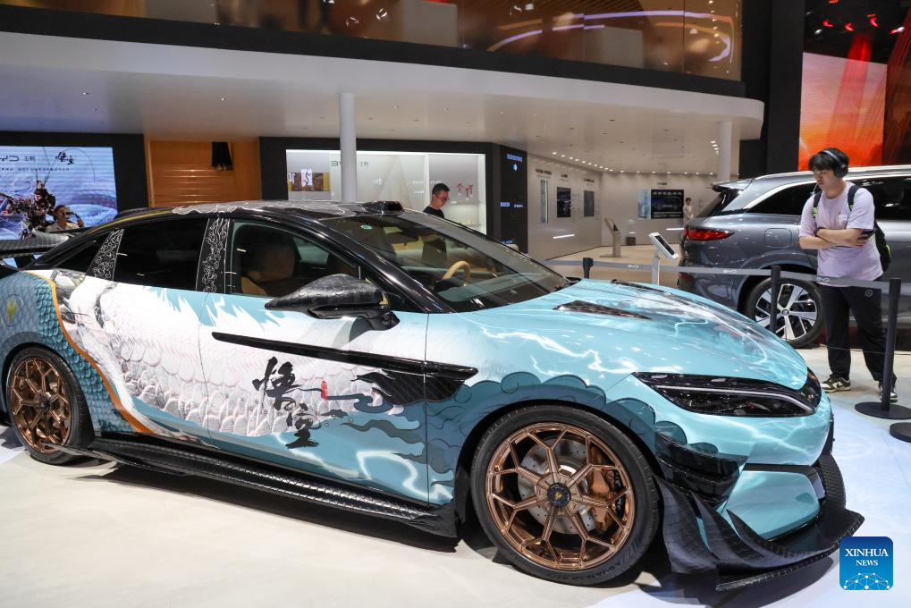 A visitor watches a special edition car of BYD during the 2025 Guangdong-Hong Kong-Macao Greater Bay Area International Auto Show in Shenzhen, south China's Guangdong Province, May 31, 2025. (Xinhua/Liang Xu)