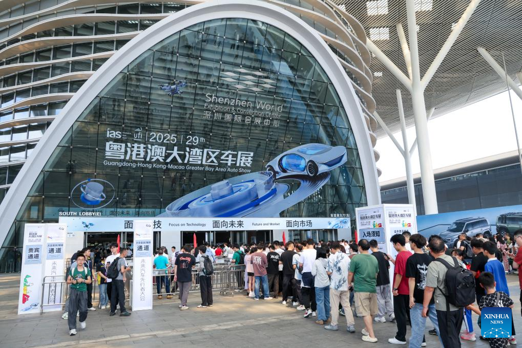 Visitors enter the Shenzhen World Exhibition and Convention Center for the 2025 Guangdong-Hong Kong-Macao Greater Bay Area International Auto Show in Shenzhen, south China's Guangdong Province, May 31, 2025. (Xinhua/Liang Xu)