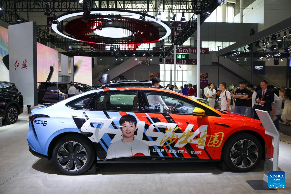 Visitors look at vehicles at the booth of Hongqi during the 2025 Guangdong-Hong Kong-Macao Greater Bay Area International Auto Show in Shenzhen, south China's Guangdong Province, May 31, 2025. (Xinhua/Liang Xu)