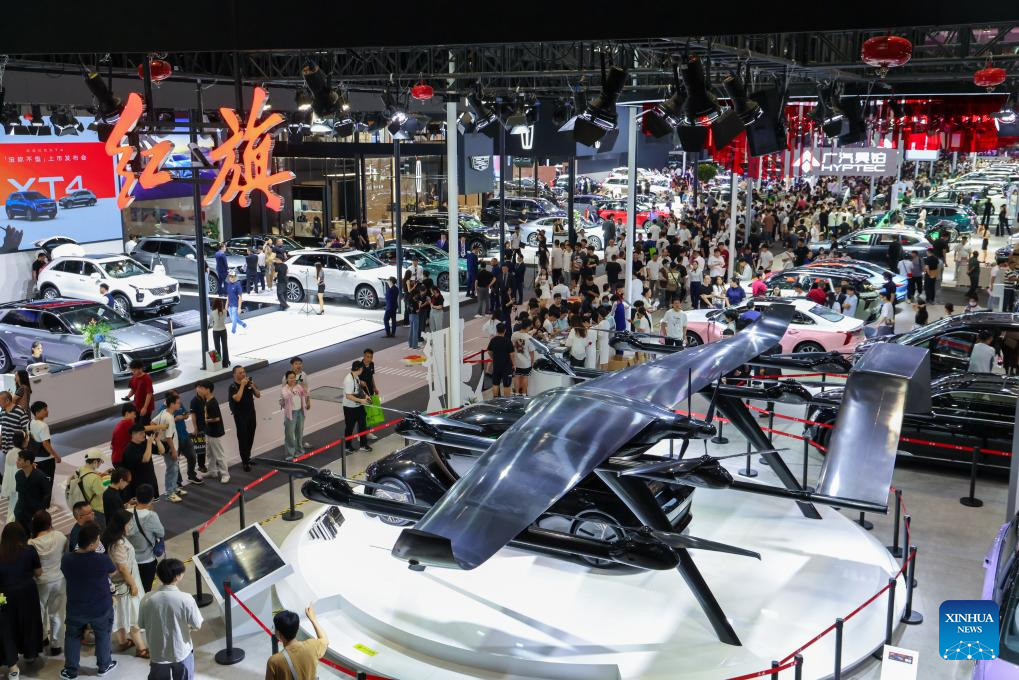 A flying car of Hongqi is displayed at the 2025 Guangdong-Hong Kong-Macao Greater Bay Area International Auto Show in Shenzhen, south China's Guangdong Province, May 31, 2025. (Xinhua/Liang Xu)