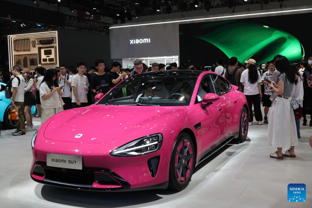 A car of Xiaomi SU7 series is displayed during the 2025 Guangdong-Hong Kong-Macao Greater Bay Area International Auto Show in Shenzhen, south China's Guangdong Province, May 31, 2025. (Xinhua/Liang Xu)