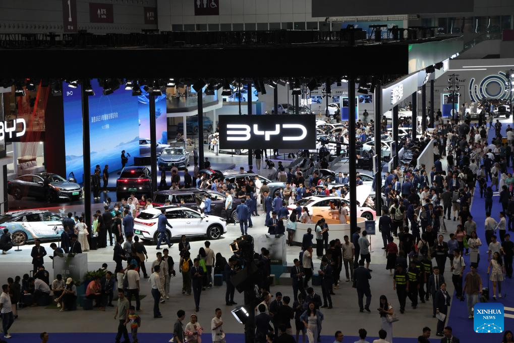 Visitors tour the booth of BYD during the 2025 Guangdong-Hong Kong-Macao Greater Bay Area International Auto Show in Shenzhen, south China's Guangdong Province, May 31, 2025. (Xinhua/Liang Xu)