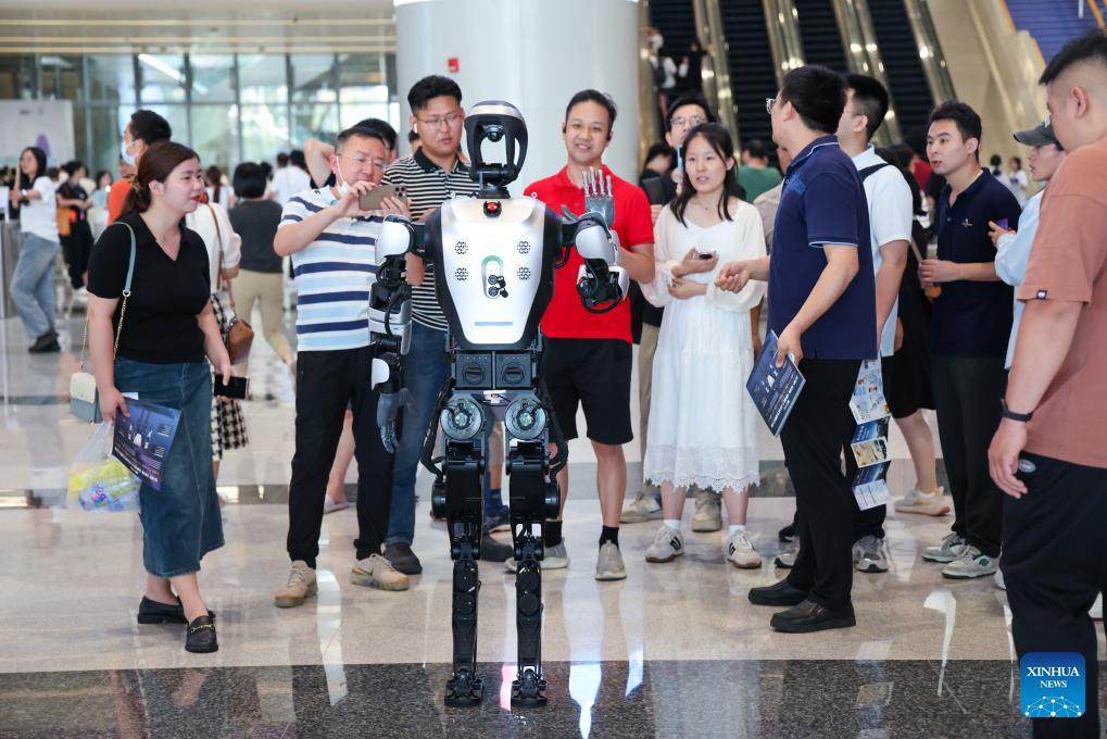 Visitors interact with a robot during the 2025 Guangdong-Hong Kong-Macao Greater Bay Area International Auto Show in Shenzhen, south China's Guangdong Province, May 31, 2025. (Xinhua/Liang Xu)