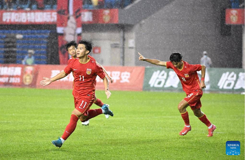 Liang Shiyu (L) of China U-16 team celebrates his goal during the match between China U-16 team and Vietnam U-16 team at 2025 CFA Team China International Tournament in Hohhot, north China's Inner Mongolia Autonomous Region, May 30, 2025. (Xinhua/Bei He)