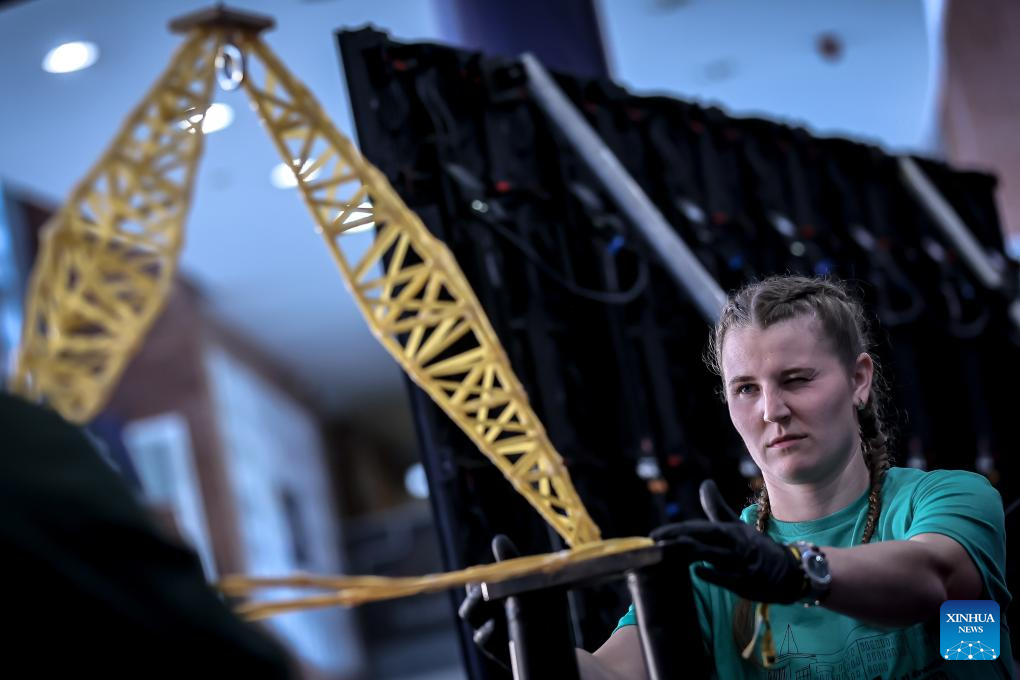 A contestant places a spaghetti bridge on the instrument used to test its load-bearing capacity at the 10th Jubilee World Championship in Spaghetti Bridge Building, held at Obuda University in Budapest, Hungary on May 29, 2025. (Photo by David Balogh/Xinhua)