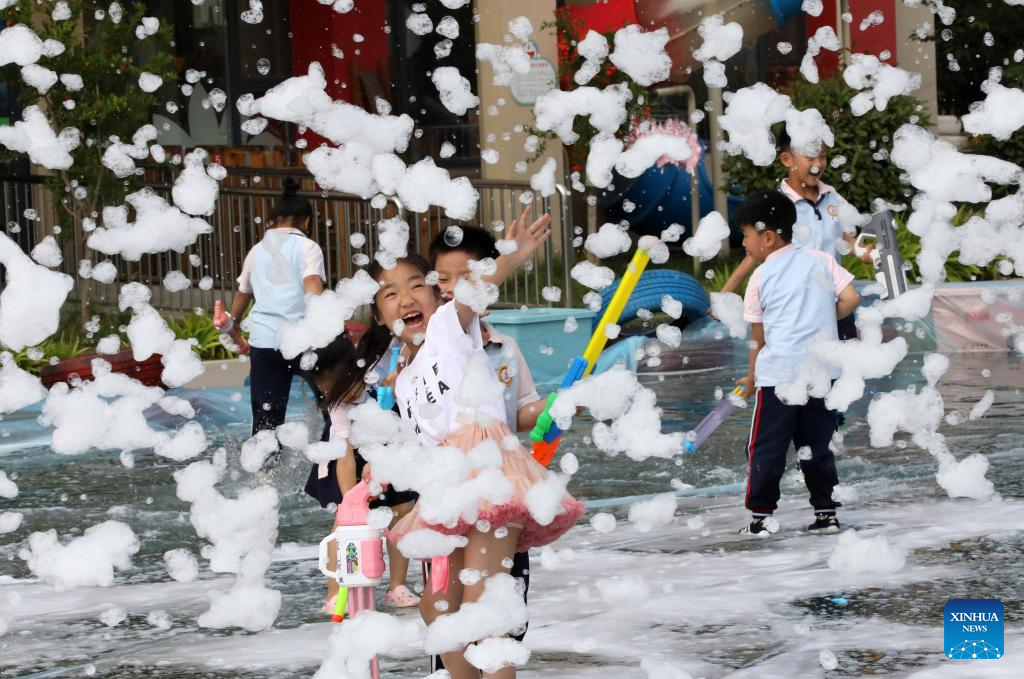 Children play in the pool at a kindergarten ahead of the International Children's Day in Boxing County of Binzhou City, east China's Shandong Province, May 28, 2025. (Photo by Chen Bin/Xinhua)