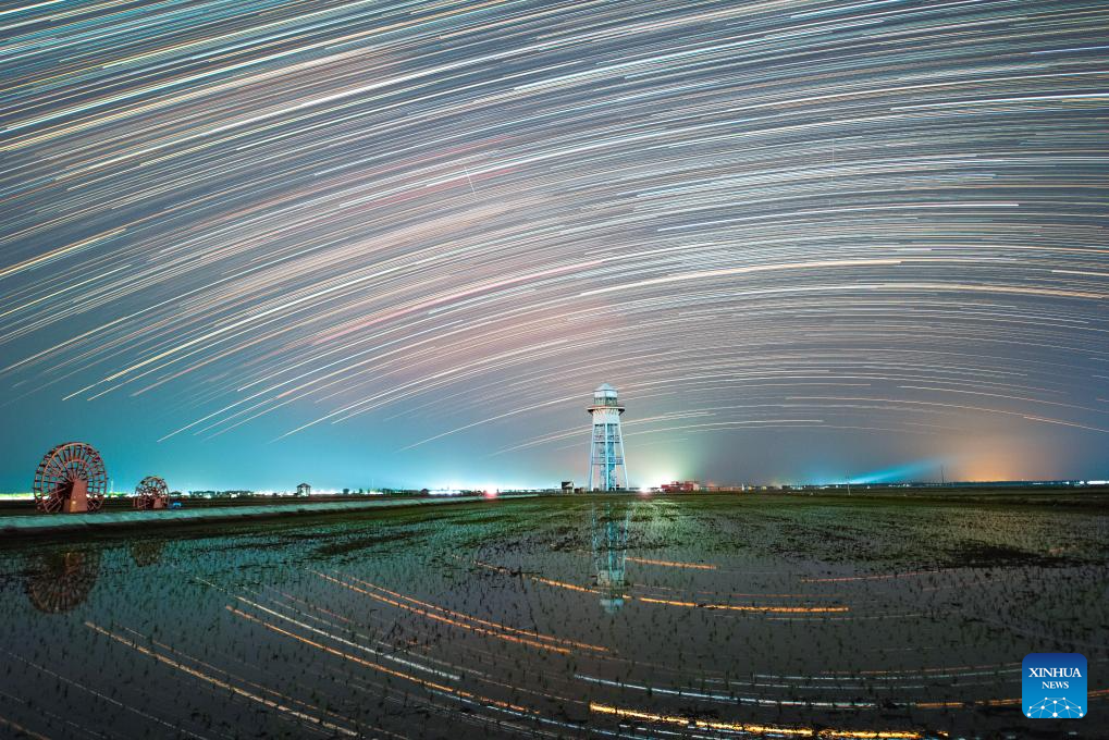 This stack composite photo taken on May 27, 2025 shows a paddy rice field under the starry sky in Fujin, Jiamusi City, northeast China's Heilongjiang Province.