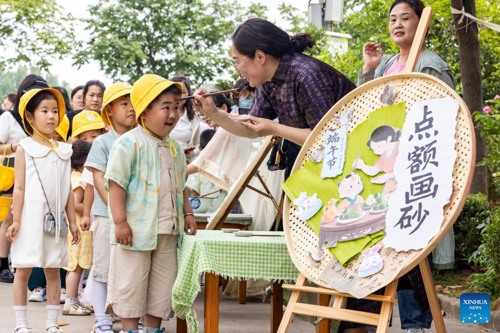 A teacher draws a dot with cinnabar on a child's forehead at a kindergarten in Hailing District of Taizhou City, east China's Jiangsu Province, May 30, 2025.