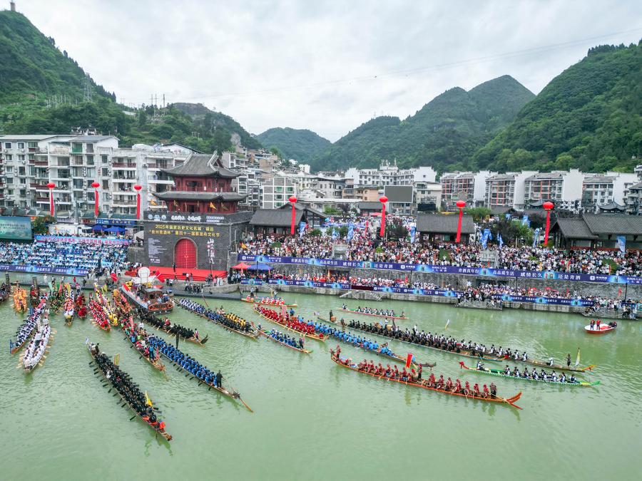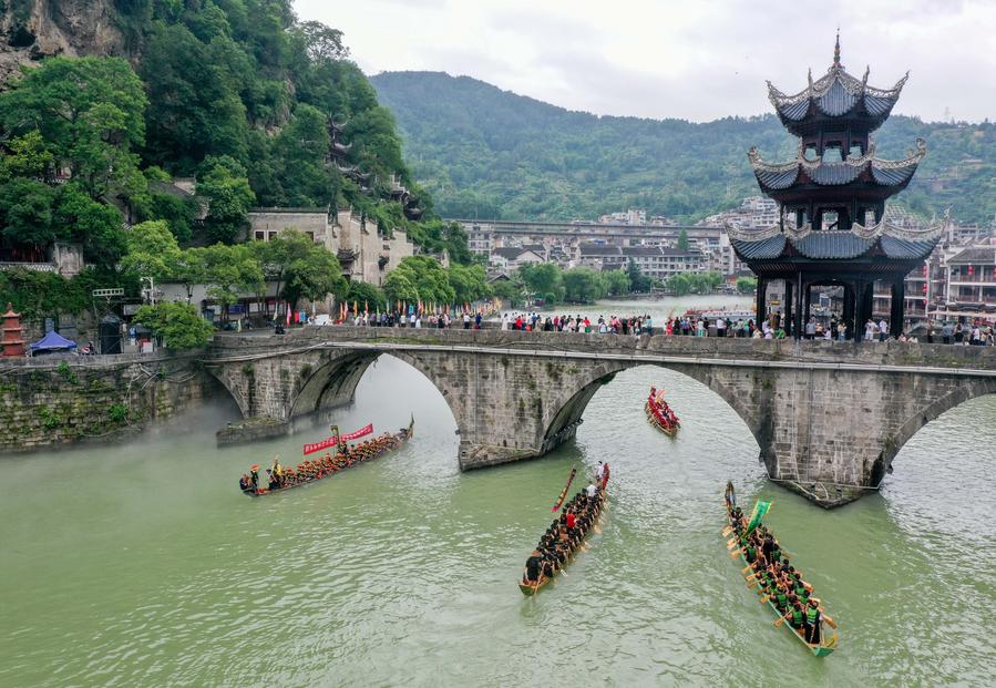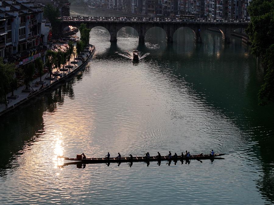Locals row a dragon boat in Zhenyuan ancient town in Qiandongnan Miao and Dong Autonomous Prefecture in southwest China's Guizhou Province, May 20, 2025. (Xinhua/Ou Dongqu)