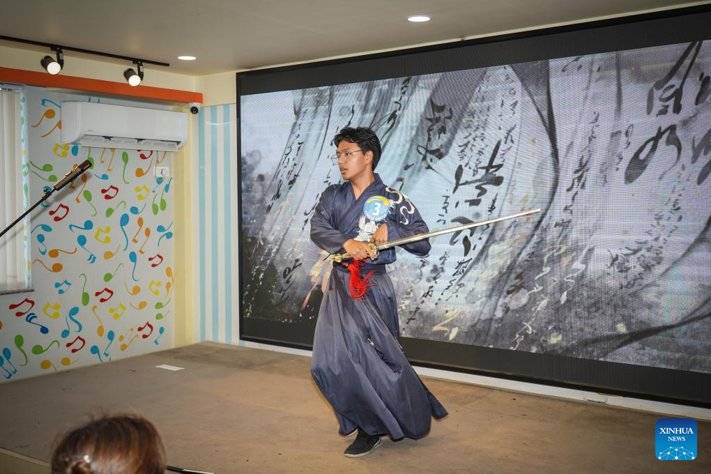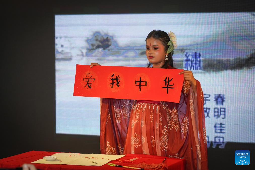 A contestant performs a talent show at the 18th "Chinese Bridge" Chinese proficiency competition for foreign secondary school students in Lalitpur, Nepal, on May 30, 2025. The final rounds of "Chinese Bridge" Chinese proficiency competitions for primary-and secondary-school students in Nepal were held on Friday in Lalitpur, a city in the Kathmandu Valley. (Photo by Hari Maharjan/Xinhua)