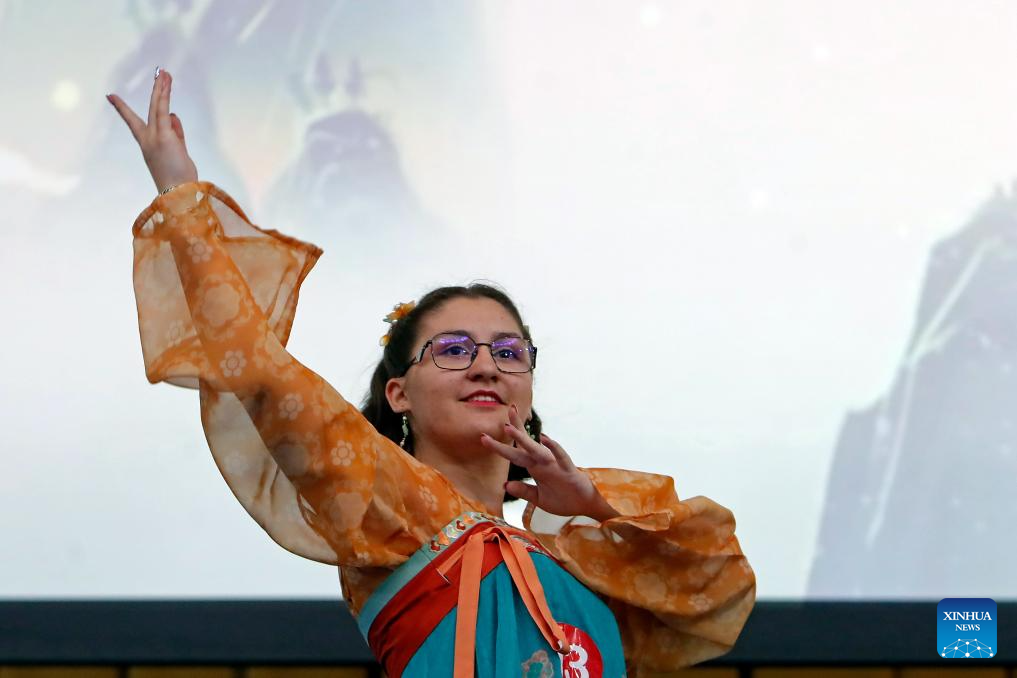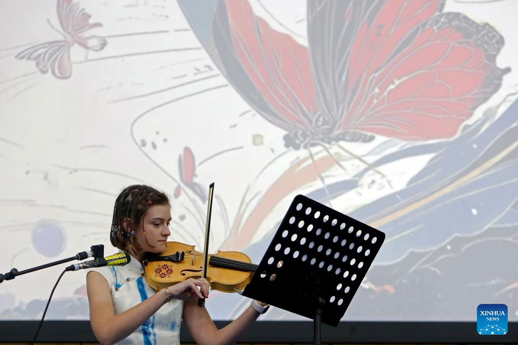 A contestant performs during the 18th "Chinese Bridge" Chinese Proficiency Competition for Foreign Secondary School Students in Bucharest, Romania, May 31, 2025. (Photo by Cristian Cristel/Xinhua)