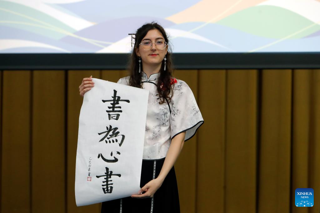 A contestant displays her calligraphy work during the 18th "Chinese Bridge" Chinese Proficiency Competition for Foreign Secondary School Students in Bucharest, Romania, May 31, 2025. (Photo by Cristian Cristel/Xinhua)