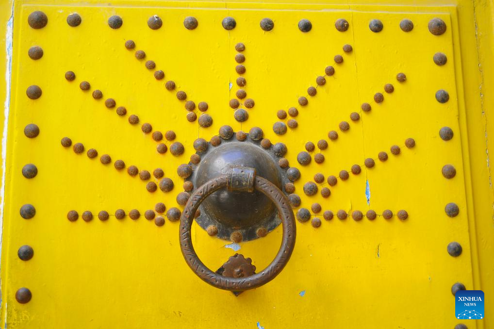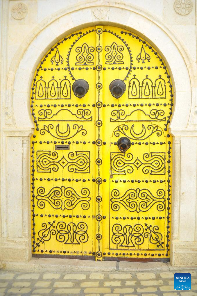 This photo shows a residential door in the Medina of Tunis, Tunisia, May 31, 2025. The Medina of Tunis was listed the World Heritage Site by the United Nations Educational, Scientific and Cultural Organization (UNESCO) in 1979. (Photo by Adel Ezzine/Xinhua)
