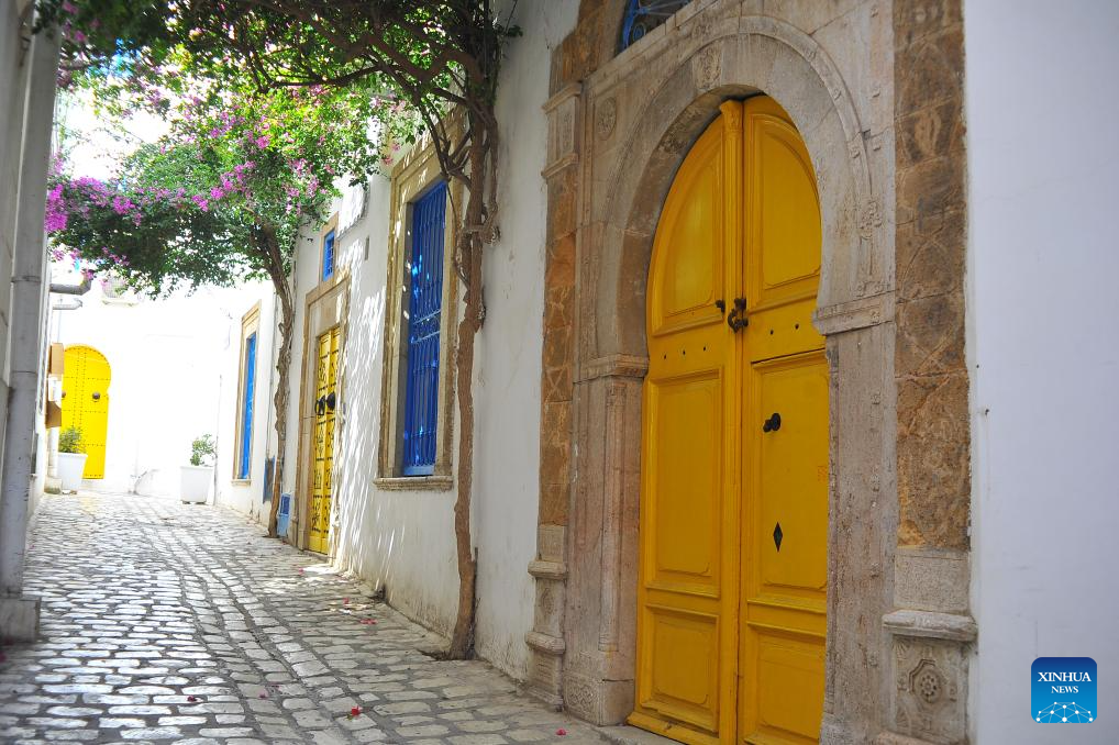 This photo shows residential doors on a street in the Medina of Tunis, Tunisia, May 31, 2025. The Medina of Tunis was listed the World Heritage Site by the United Nations Educational, Scientific and Cultural Organization (UNESCO) in 1979. (Photo by Adel Ezzine/Xinhua)