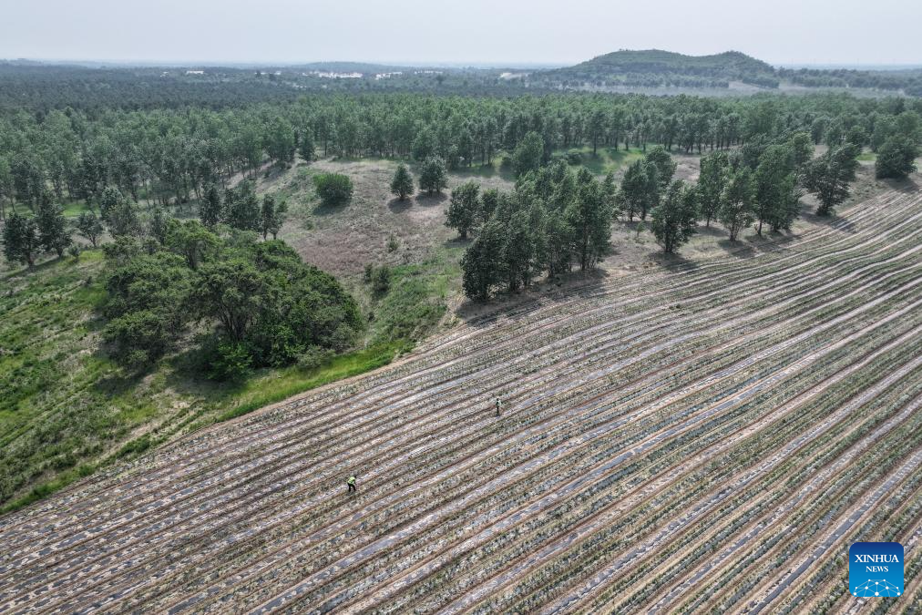 An aerial drone photo taken on May 30, 2025 shows a wild jujube plantation project in Wufeng Township of Zhangwu County in Fuxin, northeast China's Liaoning Province. Located on the southern edge of the Horqin sandy land, Zhangwu County was once plagued by sand and dust storms. For more than 70 years, people here have made unremitting efforts in transforming the ecological environment of this area to win the tough battle against desertification. The forest coverage rate of Zhangwu has increased from 2.9 percent to more than 30 percent, while the number of dusty days per year has fallen to single digits.