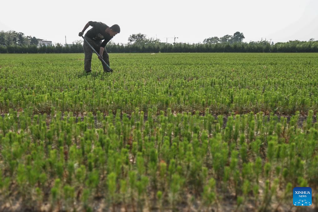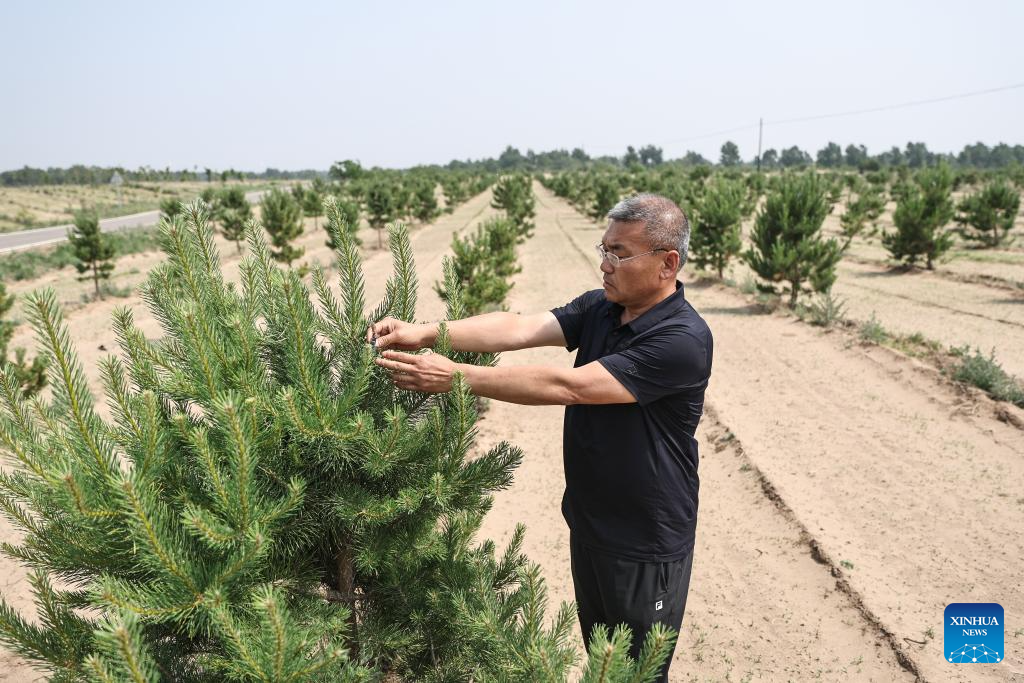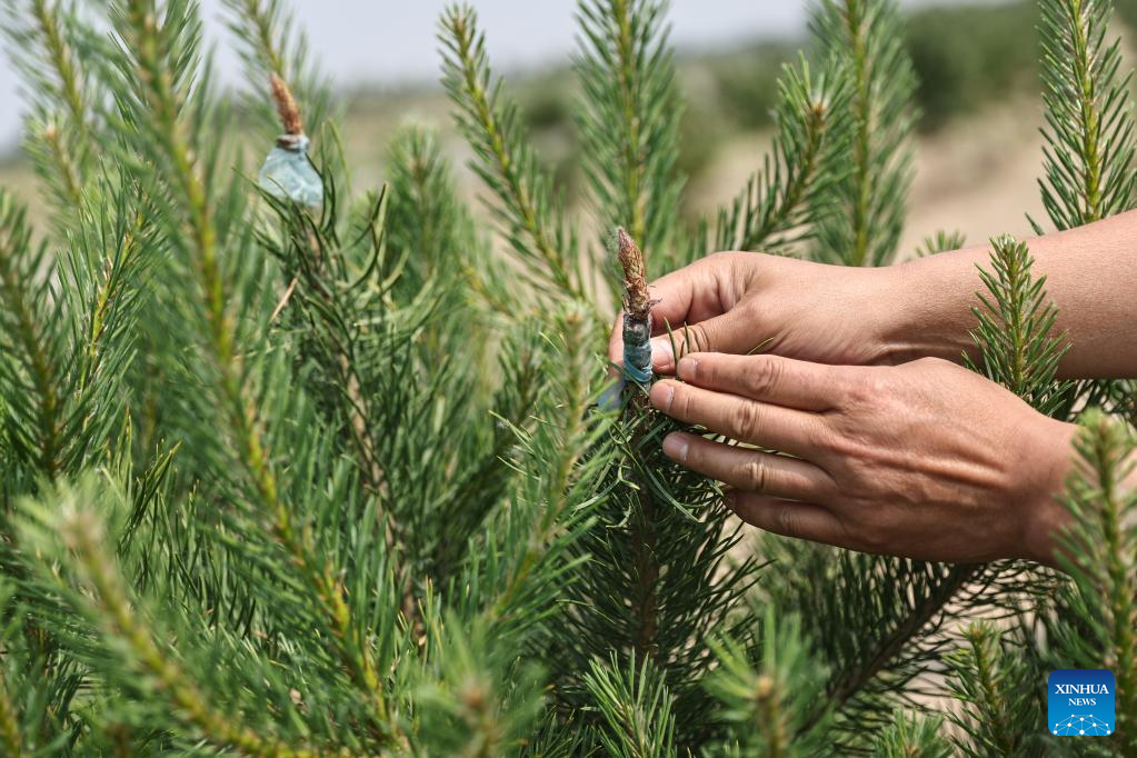 A staff member checks the growth of a grafted pine tree of a demonstration project in Dade Township of Zhangwu County in Fuxin, northeast China's Liaoning Province, May 29, 2025. Located on the southern edge of the Horqin sandy land, Zhangwu County was once plagued by sand and dust storms. For more than 70 years, people here have made unremitting efforts in transforming the ecological environment of this area to win the tough battle against desertification. The forest coverage rate of Zhangwu has increased from 2.9 percent to more than 30 percent, while the number of dusty days per year has fallen to single digits.