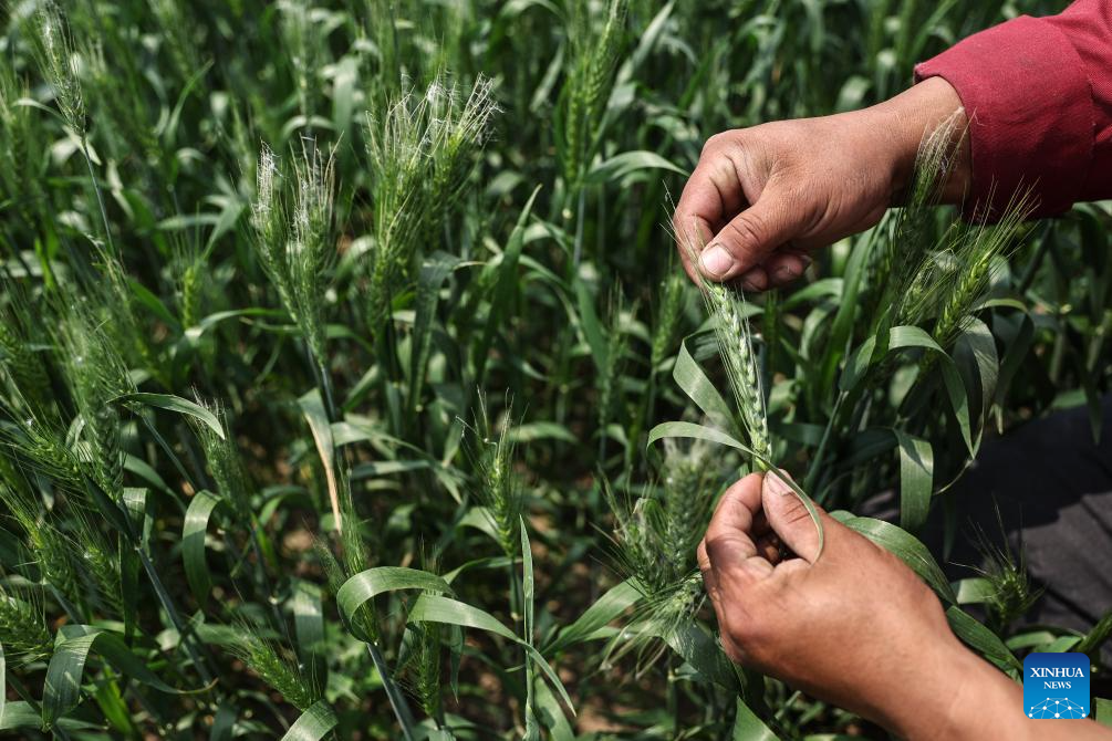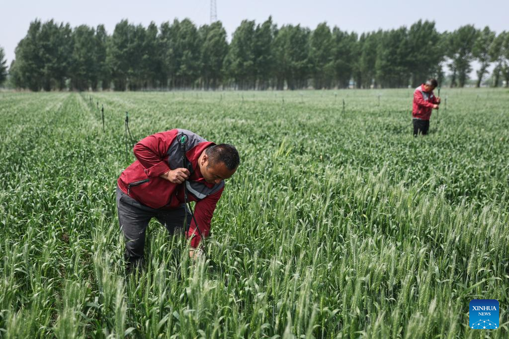 A villager checks the growth of wheat at a wheat and soybean rotation planting field in Xinglongshan Township of Zhangwu County in Fuxin, northeast China's Liaoning Province, May 29, 2025. Located on the southern edge of the Horqin sandy land, Zhangwu County was once plagued by sand and dust storms. For more than 70 years, people here have made unremitting efforts in transforming the ecological environment of this area to win the tough battle against desertification. The forest coverage rate of Zhangwu has increased from 2.9 percent to more than 30 percent, while the number of dusty days per year has fallen to single digits.