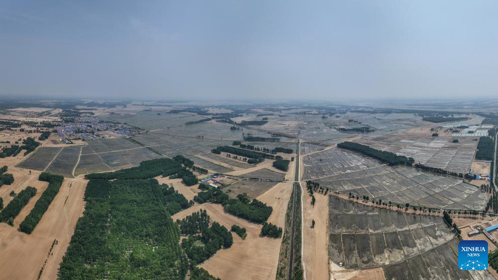 An aerial drone photo taken on May 29, 2025 shows a seedling cultivation base of Liaoning Research Institute of Sand Control and Utilization in Zhangwu County of Fuxin, northeast China's Liaoning Province. Located on the southern edge of the Horqin sandy land, Zhangwu County was once plagued by sand and dust storms. For more than 70 years, people here have made unremitting efforts in transforming the ecological environment of this area to win the tough battle against desertification. The forest coverage rate of Zhangwu has increased from 2.9 percent to more than 30 percent, while the number of dusty days per year has fallen to single digits.