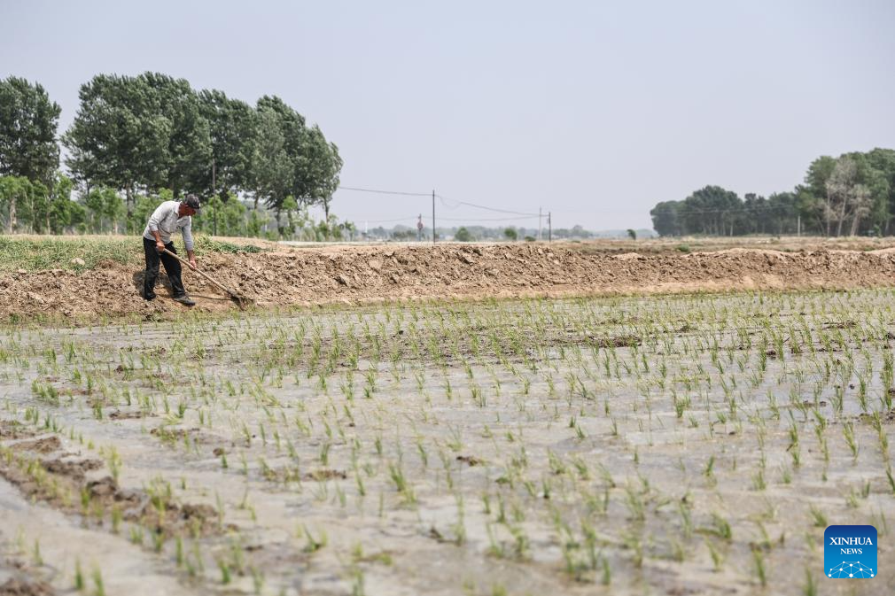 A villager works in a rice field of an ecological comprehensive management project in Daleng Township of Zhangwu County in Fuxin, northeast China's Liaoning Province, May 30, 2025. Located on the southern edge of the Horqin sandy land, Zhangwu County was once plagued by sand and dust storms. For more than 70 years, people here have made unremitting efforts in transforming the ecological environment of this area to win the tough battle against desertification. The forest coverage rate of Zhangwu has increased from 2.9 percent to more than 30 percent, while the number of dusty days per year has fallen to single digits.