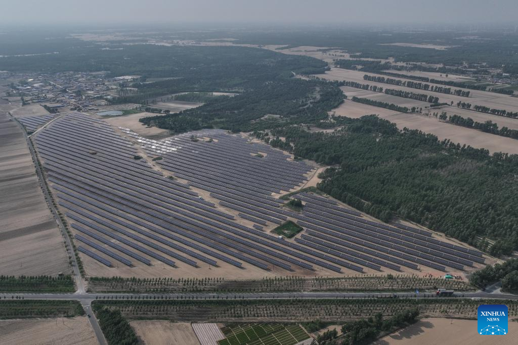 An aerial drone photo taken on May 29, 2025 shows a photovoltaic and sand-control project in Zhanggutai Township of Zhangwu County in Fuxin, northeast China's Liaoning Province. Located on the southern edge of the Horqin sandy land, Zhangwu County was once plagued by sand and dust storms. For more than 70 years, people here have made unremitting efforts in transforming the ecological environment of this area to win the tough battle against desertification. The forest coverage rate of Zhangwu has increased from 2.9 percent to more than 30 percent, while the number of dusty days per year has fallen to single digits.