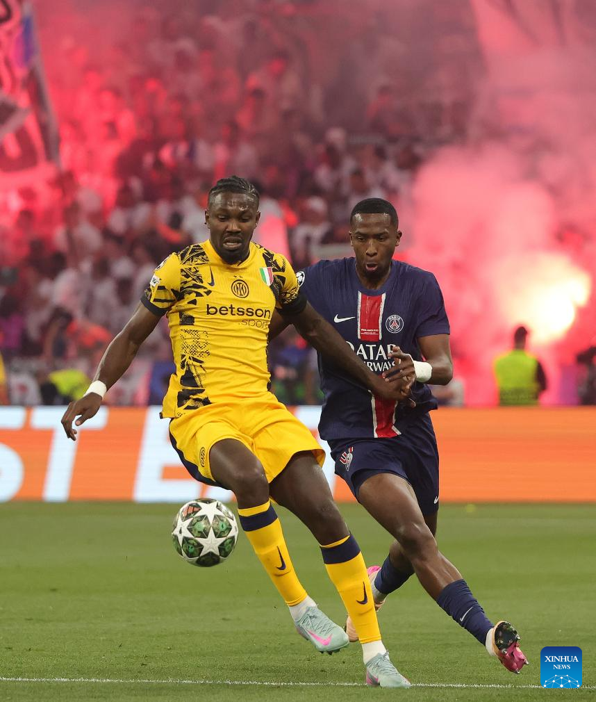 Denzel Dumfries (R) of Inter Milan vies with Nuno Mendes (C) of Paris Saint-Germain during the UEFA Champions League final match between Paris Saint-Germain and Inter Milan in Munich, Germany, May 31, 2025. (Xinhua/Peng Ziyang)