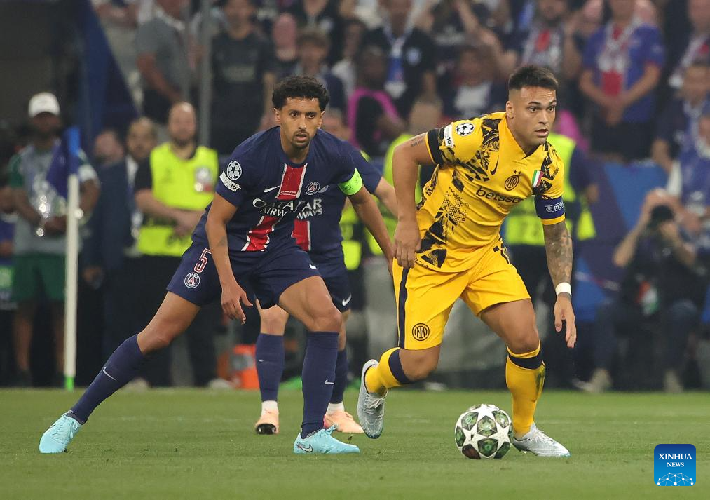 Marquinhos (L) of Paris Saint-Germain vies with Lautaro Martinez of Inter Milan during the UEFA Champions League final match between Paris Saint-Germain and Inter Milan in Munich, Germany, May 31, 2025. (Photo by Philippe Ruiz/Xinhua)