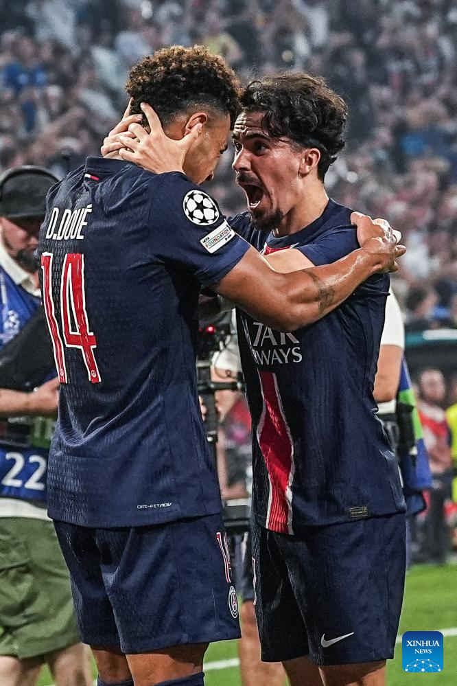 Desire Doue (L) of Paris Saint-Germain celebrates his goal during the UEFA Champions League final match between Paris Saint-Germain and Inter Milan in Munich, Germany, May 31, 2025. (Xinhua/Peng Ziyang)
